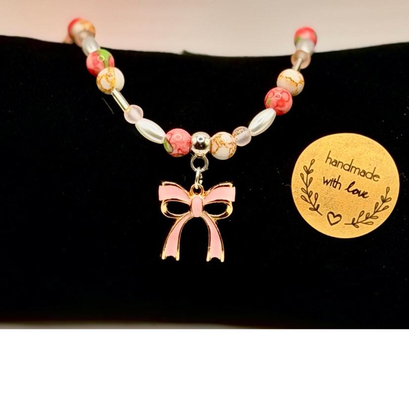 Sweet bow pendants and a romantic heart pendant perfectly complement the design.