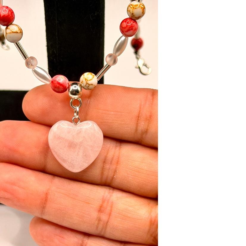 Pearl mix in pink, red, and natural tones, freshwater pearls (only the freshwater pearls are real, all other stones are a mix), glass beads, pendant clasp stainless steel.