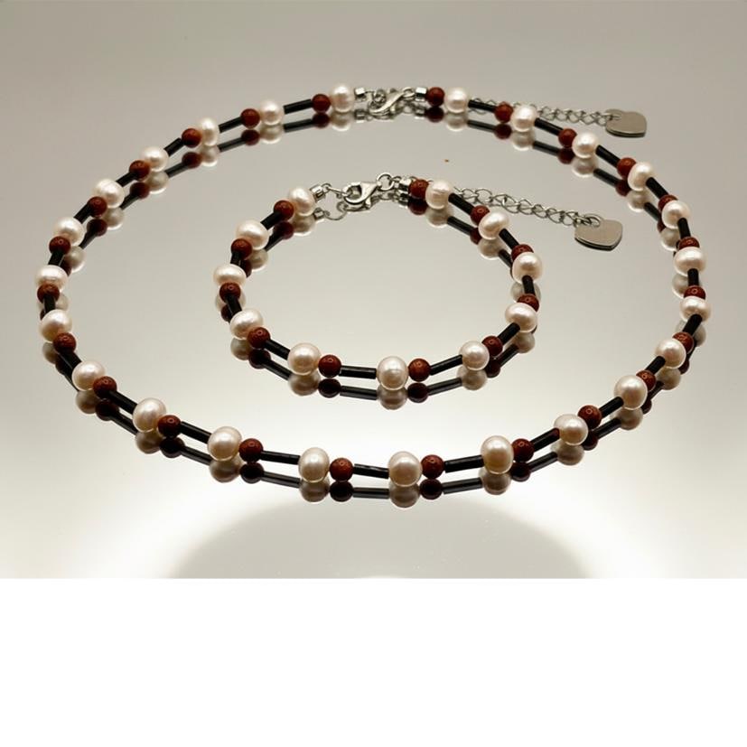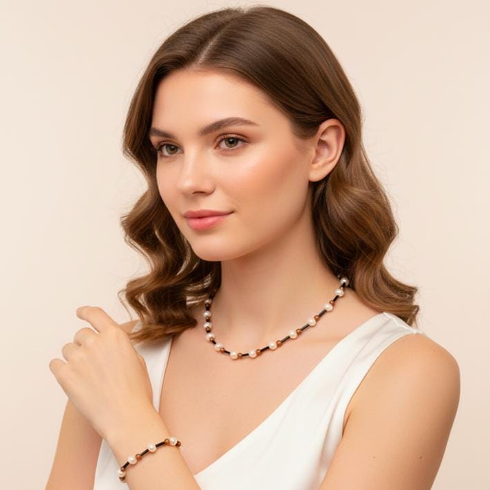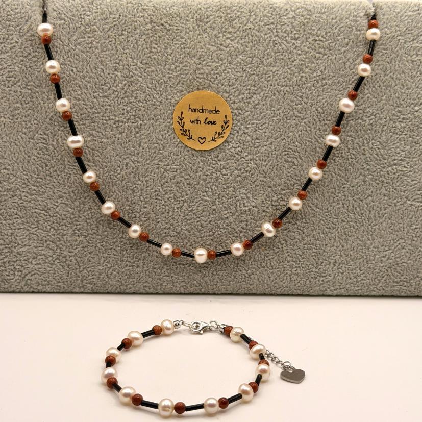 This handcrafted necklace and bracelet set combines timeless elegance with warm, natural tones. White freshwater pearls, brown goldstone pearls, and delicate black spacers create a harmonious look that is both modern and classic. The silver-tone details and small heart charms add a touch of love and sophistication.