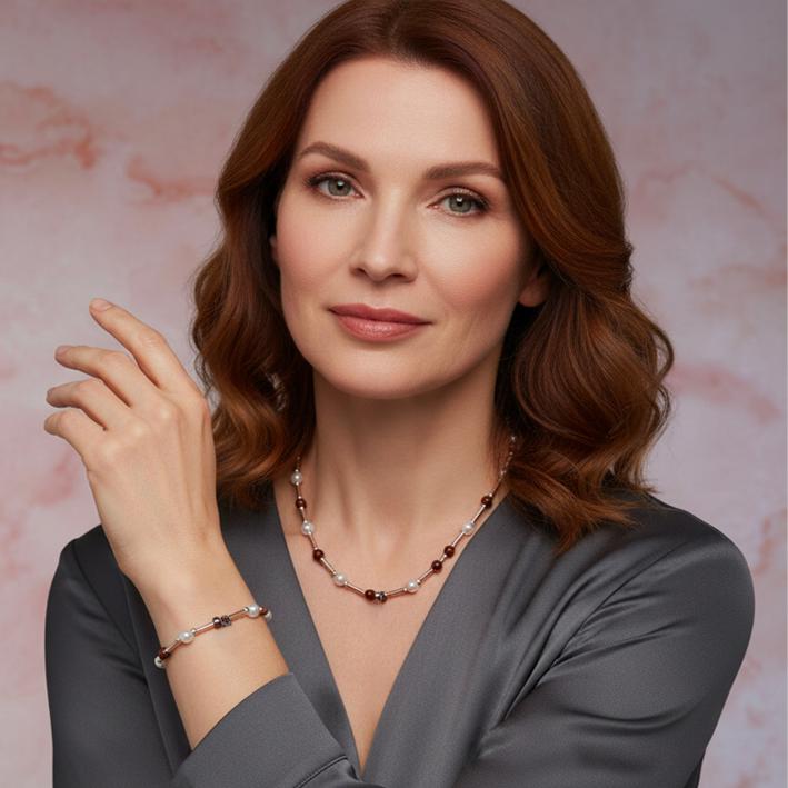 Add a special touch to your look with this lovingly handcrafted jewelry set. The delicate combination of shimmering pearls and warm, earthy accents makes this necklace and matching bracelet a stylish companion – whether for everyday wear or special occasions.